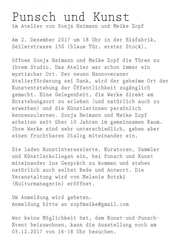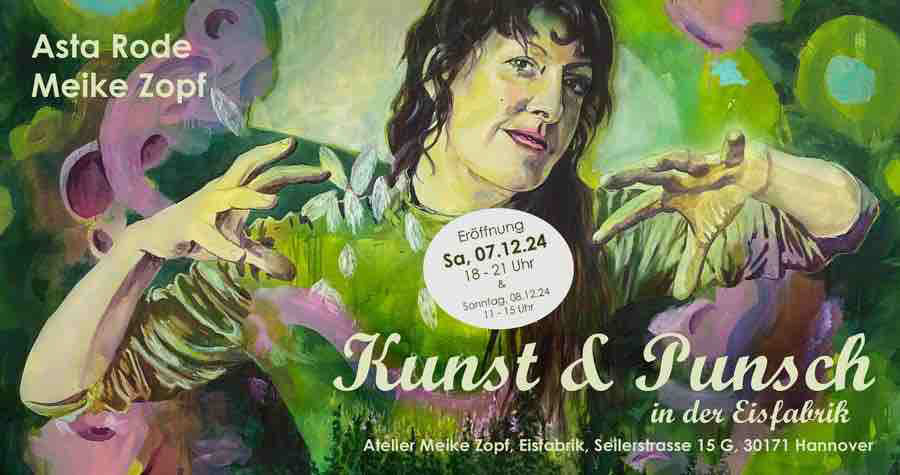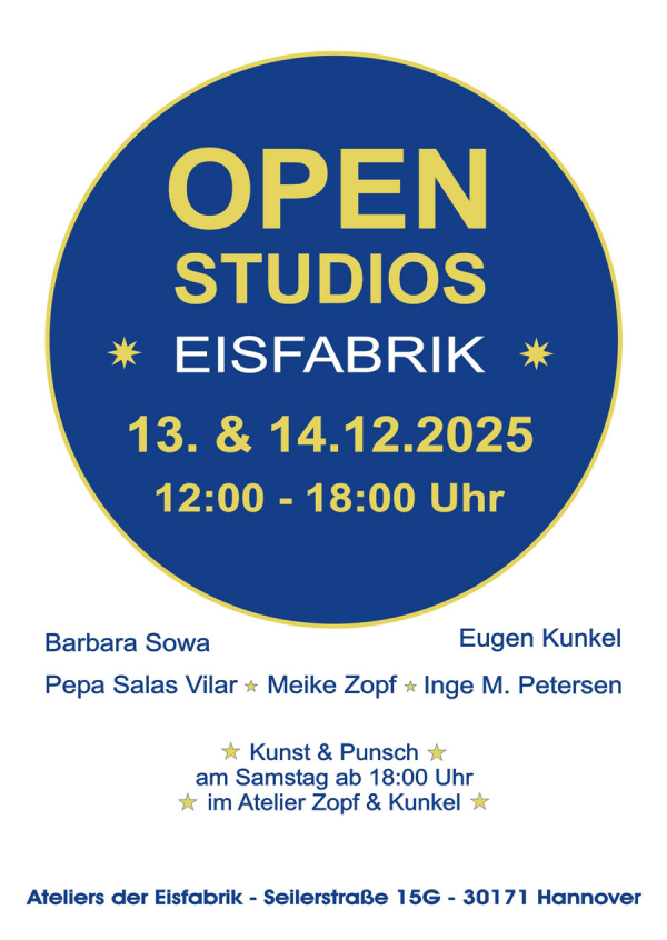 Der verschobene Atelierspaziergang aus 2020 findet endlich statt! Am 7. November 2021 ist mein Atelier geöffnet! Ich freue mich auf Ihren und Euren Besuch in der Eisfabrik! Ausstellung im Schloss Landestrost, Neustadt 06. November bis 05. Dezember 2021 Atelierbesuche: 7.11. und 14.11.2021 Die Liste der teilnehmenden Ateliers und die Adressen entnehmen Sie bitte unserer Website www.hannover.de.