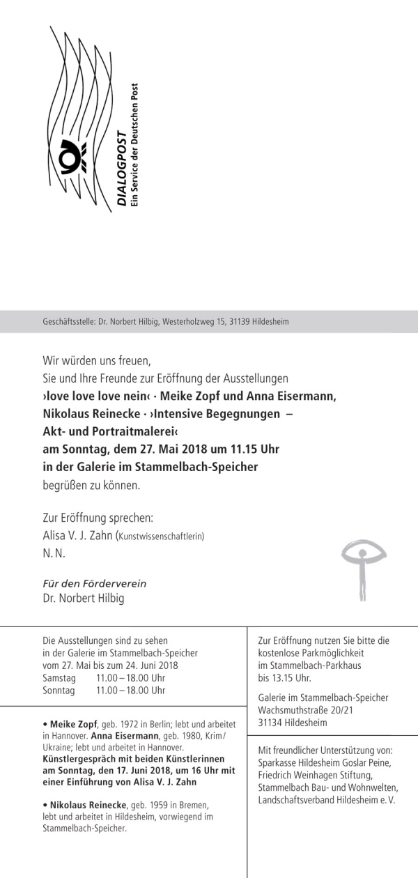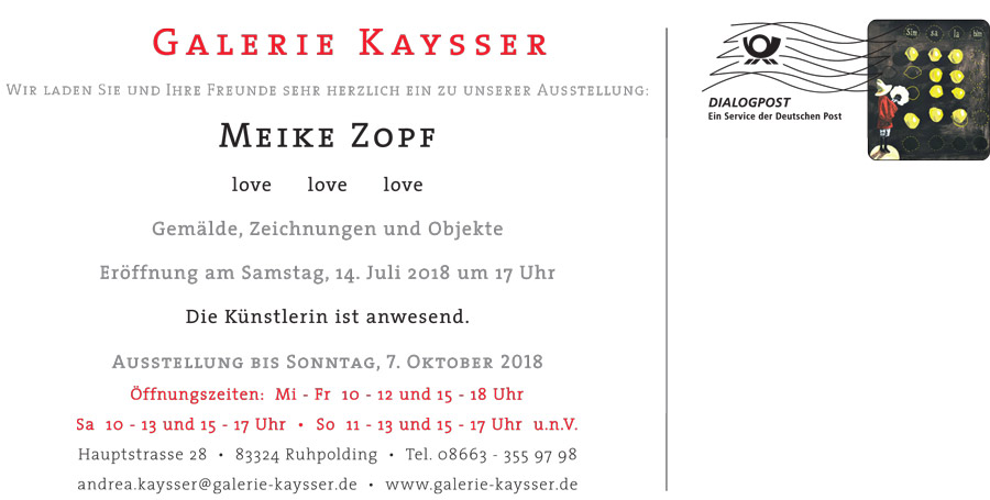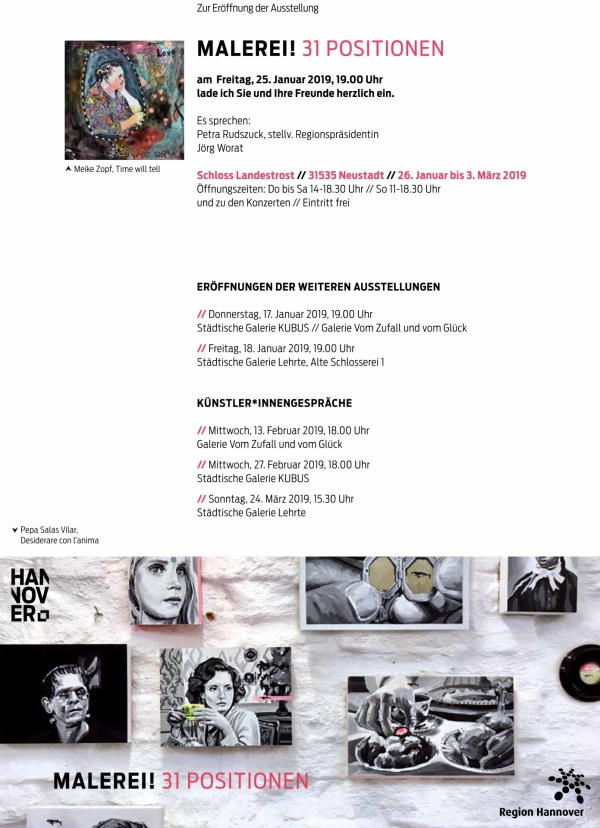 Zur Eröffnung der Ausstellung MEIKE ZOPF – VORHANG AUF! MALEREI UND ZEICHNUNG am Donnerstag, 27. Juni 2019, von 18.30 bis 20.30 Uhr im Haus der Region, Hildesheimer Straße 20, 30169 Hannover, lade ich Sie und Ihre Freunde herzlich ein. Es sprechen: Hauke Jagau, Regionspräsident Jennifer Bork, Team Kultur der Region Hannover Eine Ausstellung der Region Hannover 28. Juni bis 13. September 2019