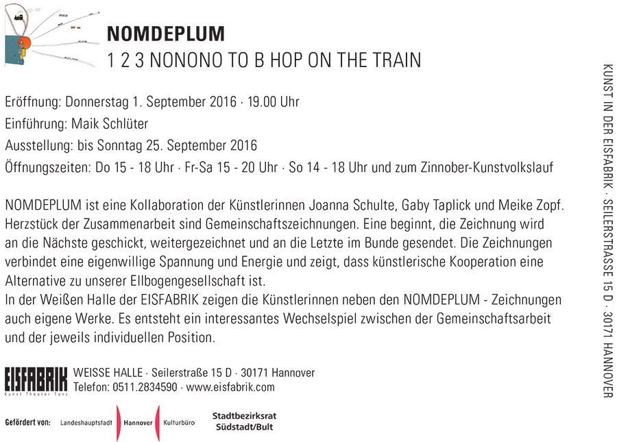 Ich bin mit NOMDEPLUM vertreten, meiner wunderbaren Künstlerinnenkooperation mit Gaby Taplick und Joanna Schulte.
